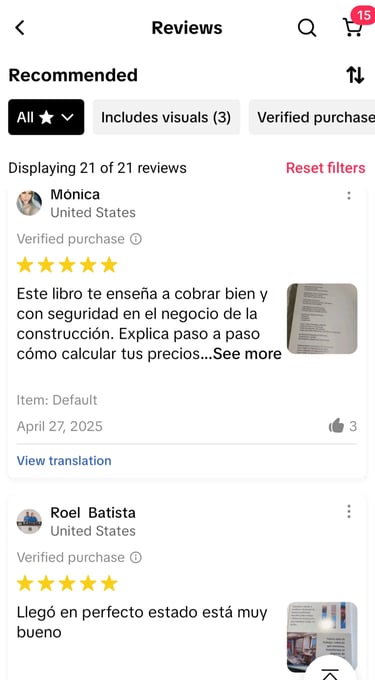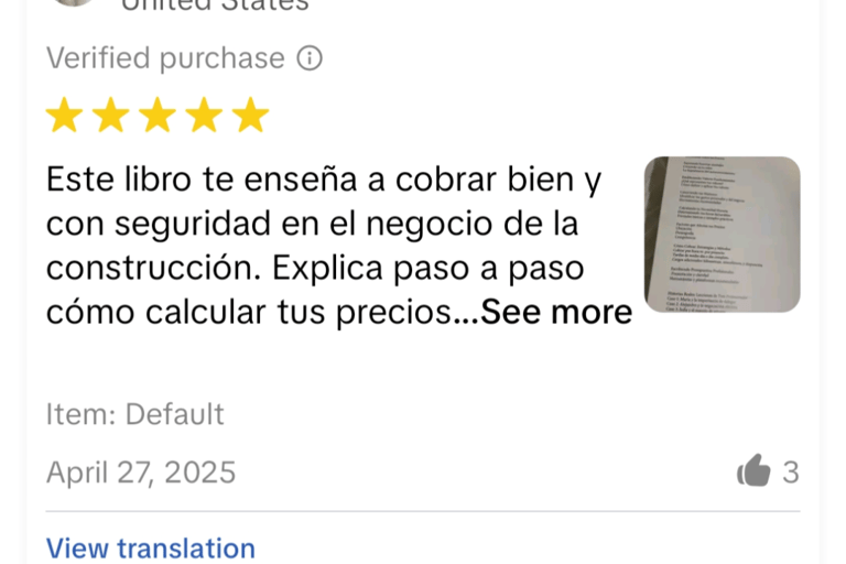 Más de 600 libros vendidos de la Guía para Fijar Precios en la Construcción en Estados Unidos y una calificación sólida basada en compras verificadas. Todos estos comentarios son reales, tomados directamente de nuestro perfil oficial en TikTok Shop bajo la marca Perro Fino.